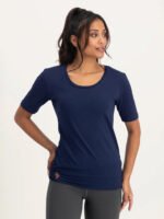 Yoga clothing should feel good and soft to wear. This comfortable yoga T-shirt is made from fine, sustainable materials. The fabric blend includes bamboo and certified organic cotton. Additionally, the material is antibacterial and easily absorbs moisture.